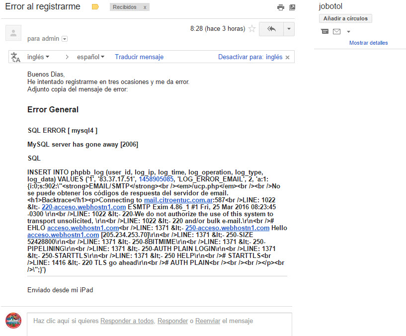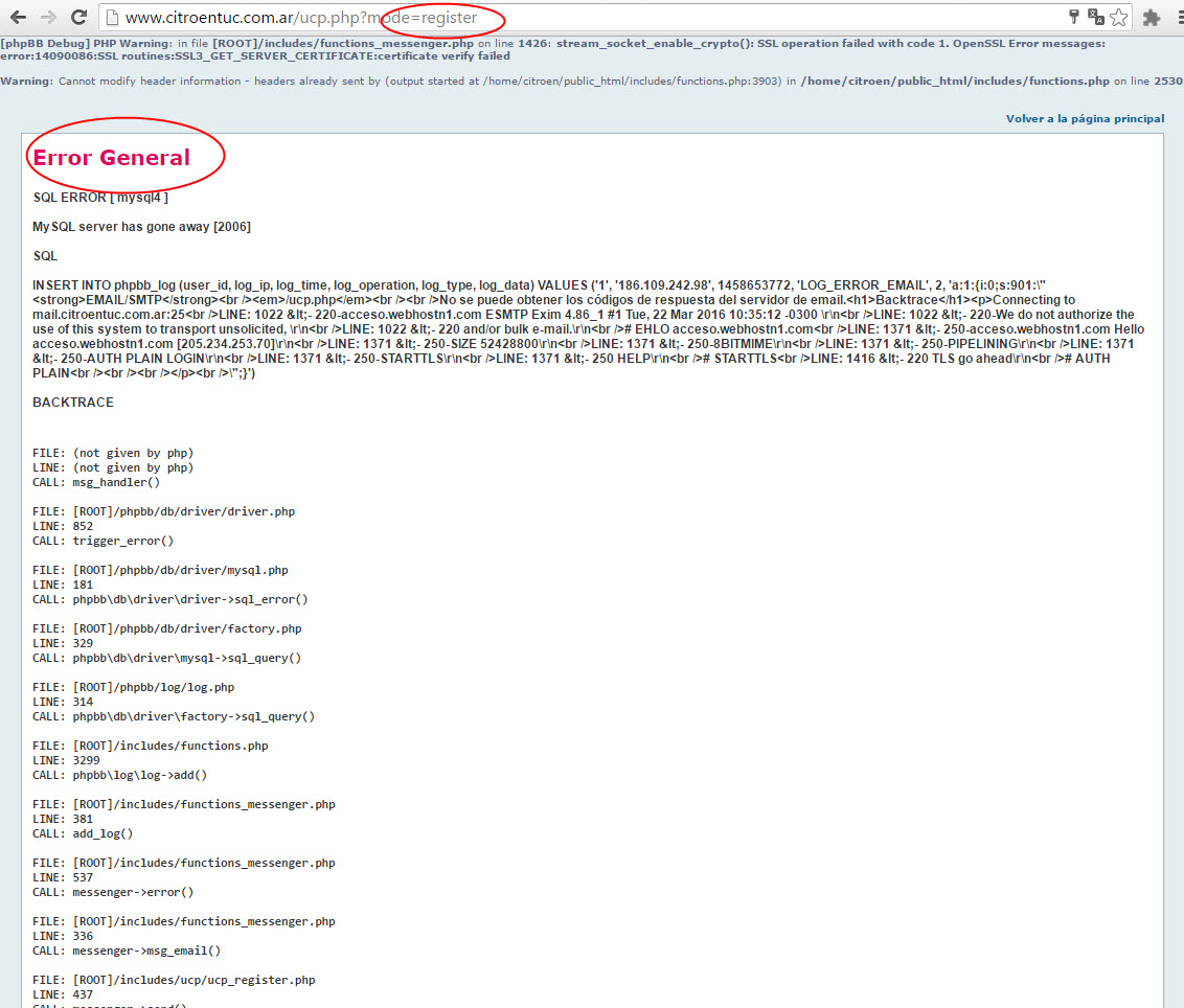 Hola Amigos! al parecer los usuarios que intentan registrarse en el foro tienen problemas por que les da el error de debug que muestro en la siguiente imagen. Aún asi! el usuario queda registrado, pero nunca se entera de ello, y como si esto no fuera poco, al revisar si ya existe dicho usuario el mismo está ya registrado pero inactivo y luego de activarlo desde el PCA manualmente tambien salta el mismo Debug que ya mostré en otro tema anterior ( AQUI) y que aun no tuve suerte de conseguir ayuda. Agradeceré si me pueden dar una manito en este tema. Muchas gracias!