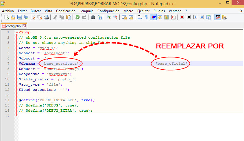 7 – Luego de eliminar, borrar o re-nombrar la carpeta INSTALL (en la nueva version phpbb 3.0.12 LIMPIA) hay que editar el archivo “config.php”……solamente deben reemplazar el nombre de la base de datos: reemplace el nombre “Base_sustituta” por el de “Base_oficial”. Recuerden editar los permisos CHMOD de este archivo a 644 (Ver imagen inferior)
