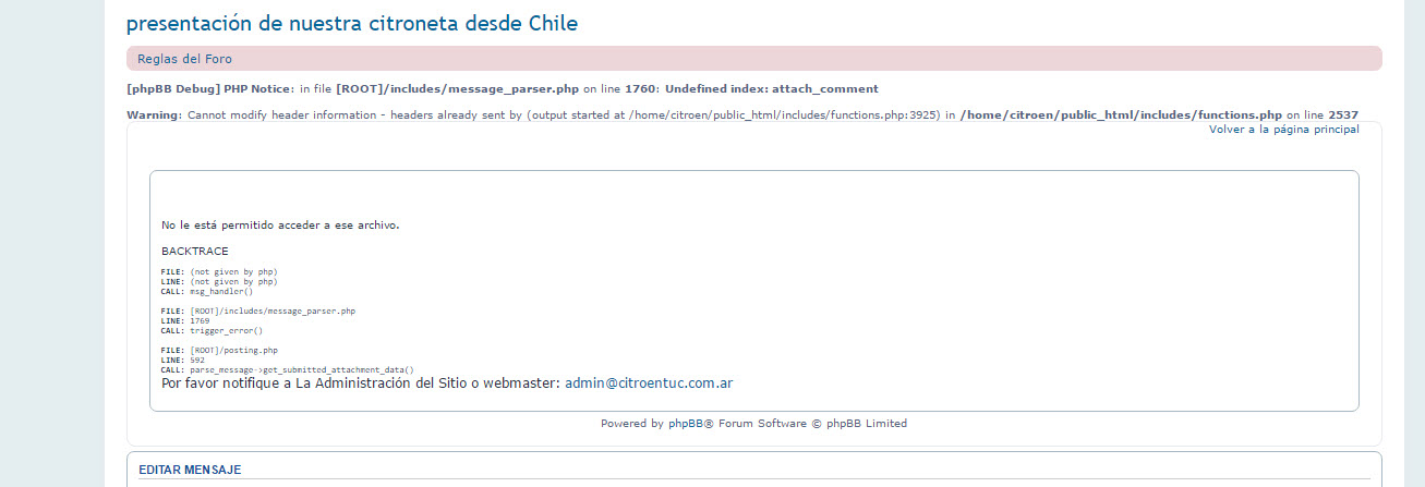 Extensiones o MODs Instalados:Activity Stats 1.2.3-DEV, Advanced BBCode Box 3.1.4., Announcements on index 1.0.1., Annual Stars 1.0.0., Board Announcements 1.0.6., Board Rules 1.0.4., Category Background Image 1.0.1, Fade header 1.1.5. , Google AdSense 1.0.0., Google Analytics 1.0.2., Google Translator 1.0.0., Lightbox 1.0.5., National Flags 2.1.3., Paypal Donation 1.0.3., PM Welcome 1.0.1., Poster IP in Viewtopic 1.0.2., Red title for new topic and new reply 1.0.2., Right Side Random Image 3.1.0., Site logo 1.0.0-b4., Thanks for posts 2.0.2., Upload Extensions 3.1.2., Youtube Videos Gallery 1.0.3.
