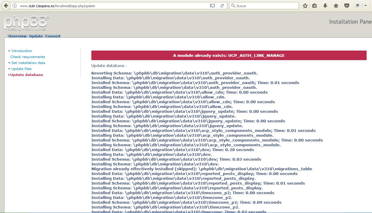 Bueno, ya llego hasta aquí... el problema es que tenía elegido un catpcha que no es por defecto... pero ahora ya si que stá todo bien... estilo prosilver, lenguaje british, limpieza de base de datos... pero en el update se me queda siempre en este paso que adjunto en la imagen... y si actualizo ya me pone lo de"The installer has detected a timeout, you may try to refresh the page, which may lead to data corruption. We suggest that you either increase your timeout settings or try to use the CLI."