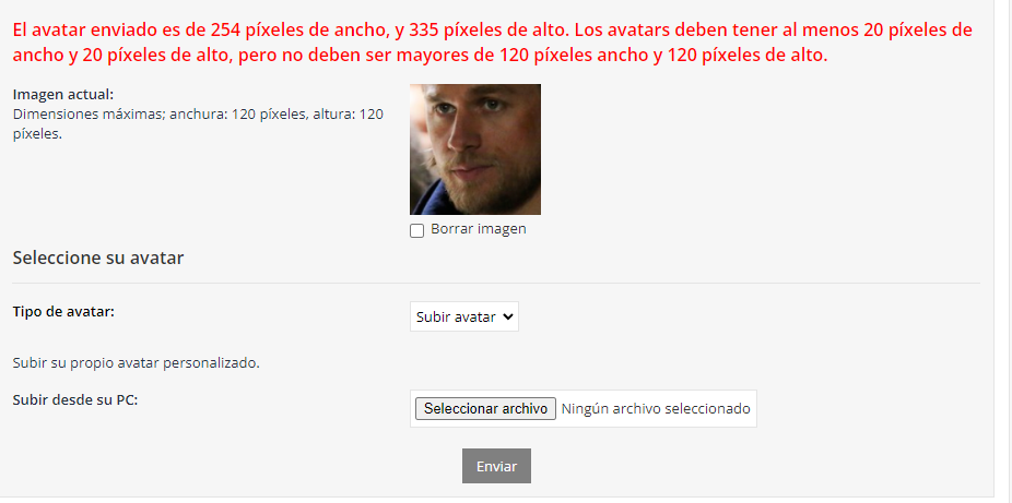 Aquí dejo una screen mas detallada, quiero añadir una foto de perfil y no me permite hacerlo, porque estableci que el limite sea 120x120. (No quiero hacerlo mas grande, porque no me gusta que se vea tan grande la foto en las publicaciones)