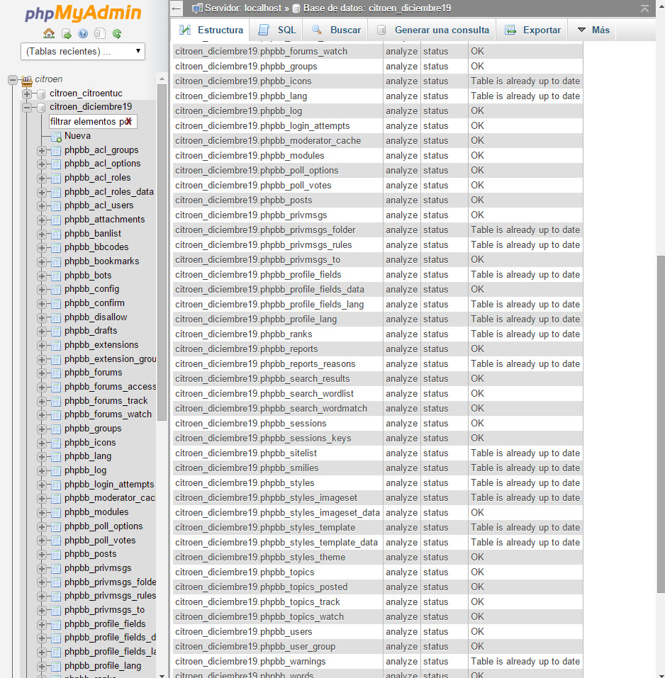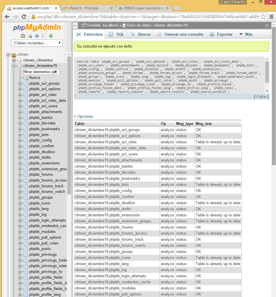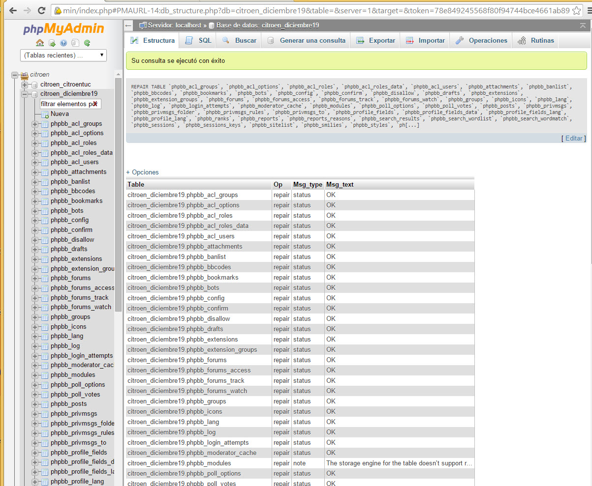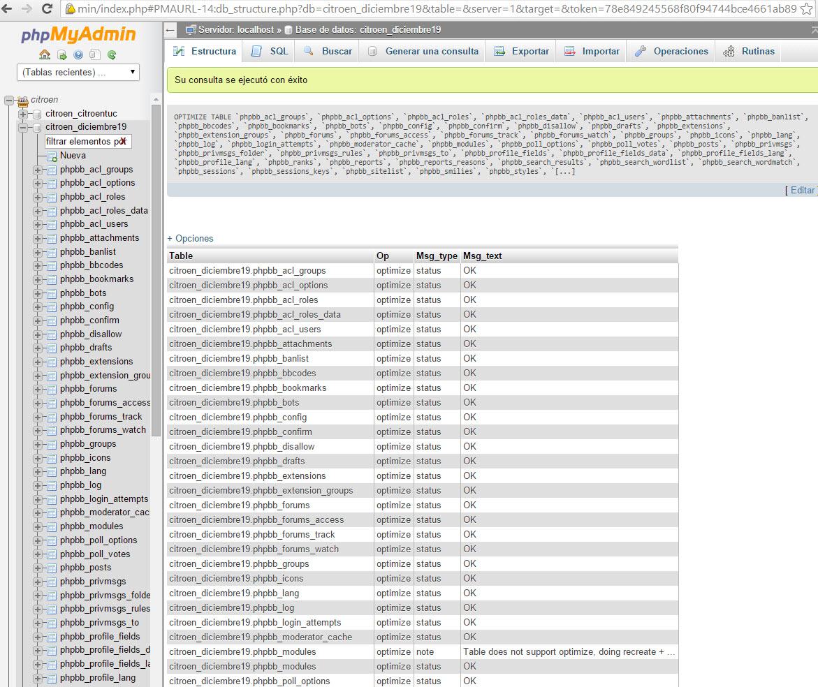 Es decir, que tenias todas las tablas bien en el analisis no te detecto ninguna corrupta?Todtuga escribió:Ya le apliqué ANALIZAR, REPARAR y OPTIMIZAR desde phpmyAdmin y el problema actual continua. Sigue dando GENERAL Error para entrar en mi foro.