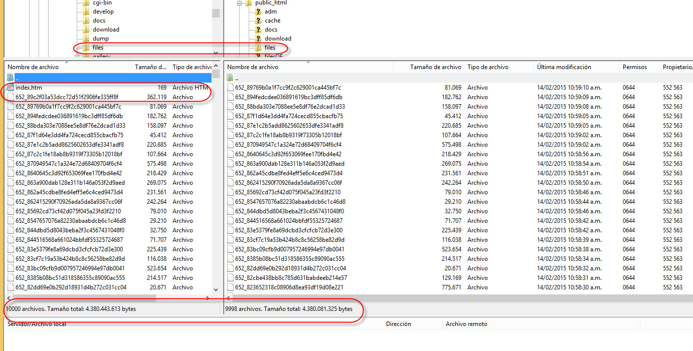 Estuve toda la noche subiendo toda la carpeta "file" nuevamente y el resultado final es que mientras que el lado de la carpeta de Origen figuran 10000 archivos dando un total de 4.380.443.613 bytes, en el lado del servidor a donde se subió toda la carpeta "files" me figuran 9998 archivos con un tamaño menor que el del origen: 4.380.081.325 bytes