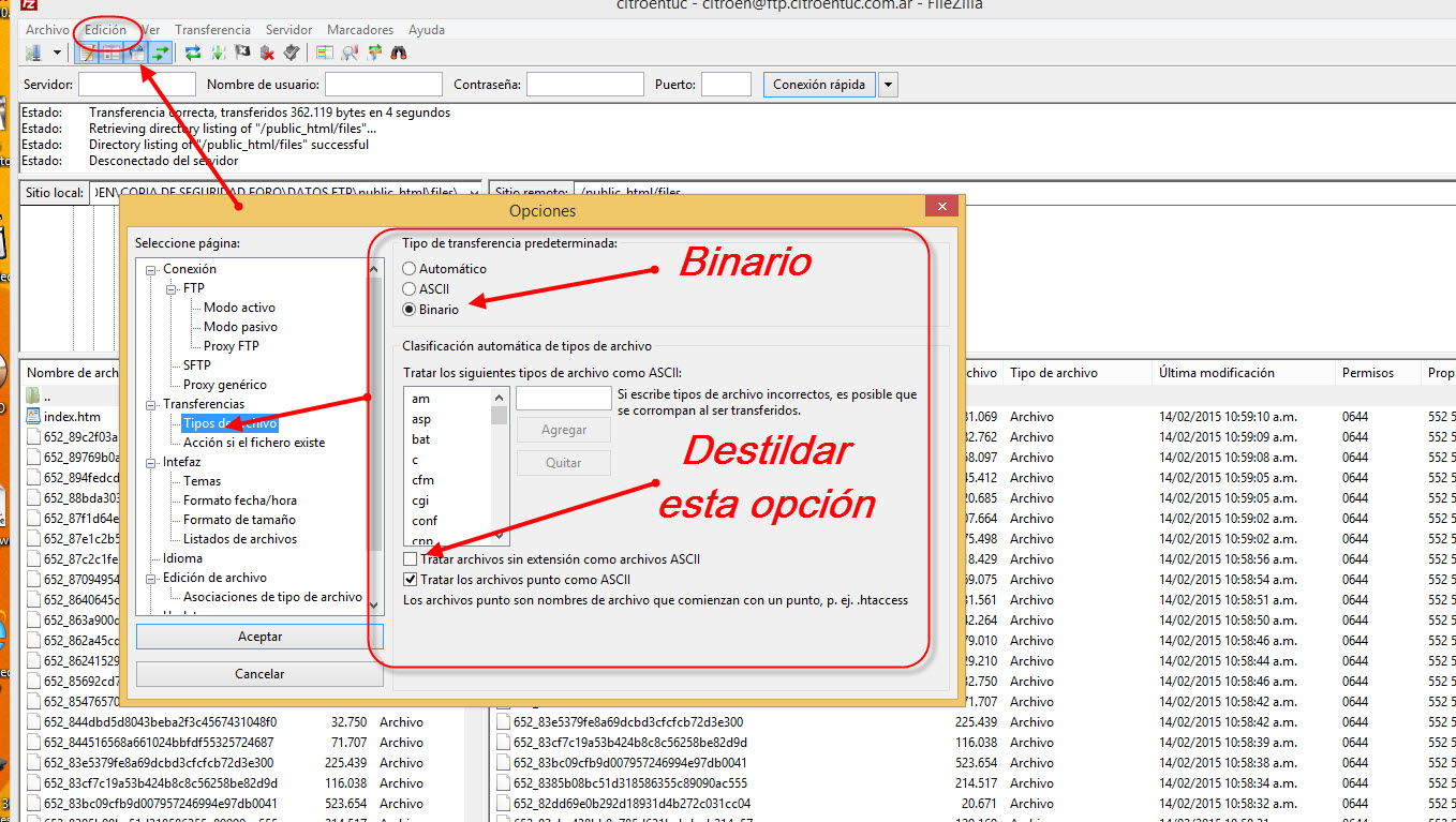 Bueno! No se si es importante pero decidí volver a subir toda la carpeta cambiando las siguientes opciones en el FileZilla