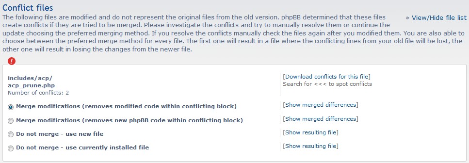 Si actualizó su foro de 3.1.3 a 3.1.4 usando el paquete de actualización automática, y ahora intenta actualizar su foro de 3.1.4 a 3.1.5 usando el paquete de actualización automática una vez más, podrá ver un conflicto en el calculo de diferencia del archivo includes/acp/acp_prune.php