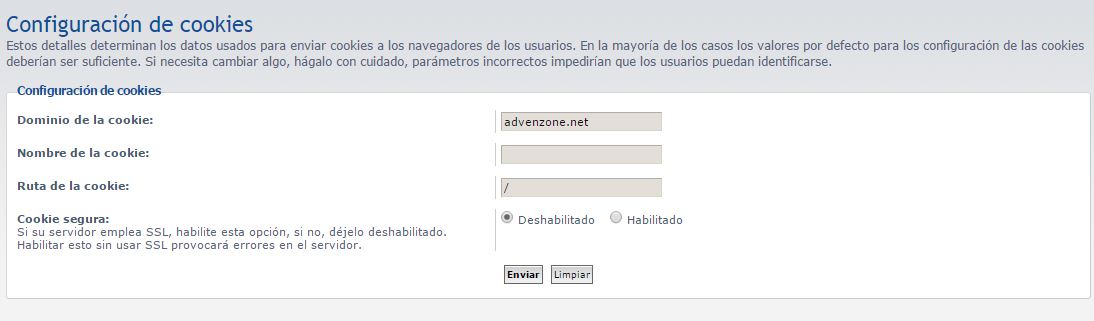 Después la configuración de las cookies la he dejado tal como está, si me comentáis que está mal pues cambio algo. No tengo nada en el nombre, arriba la url del foro con un punto, y cookie segura deshabilitado.