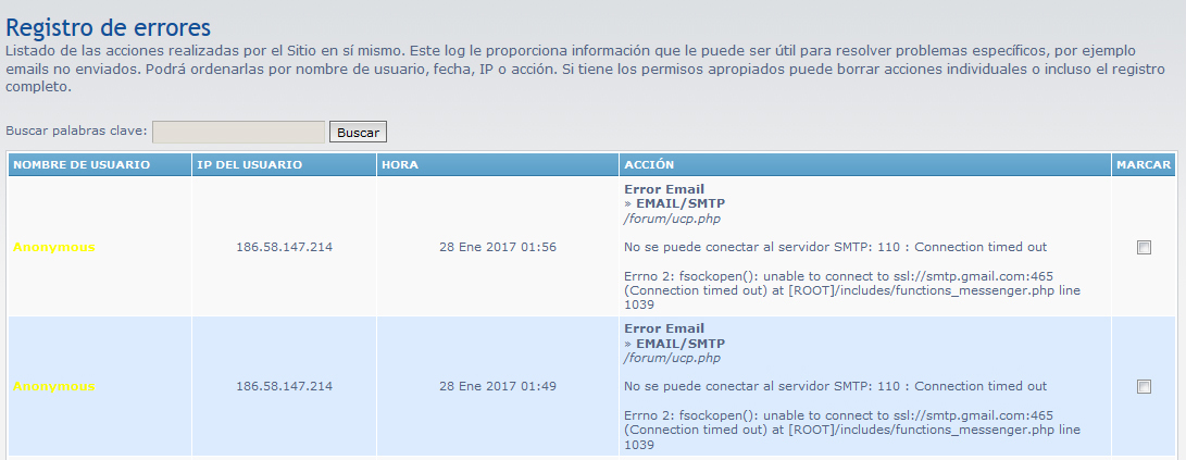 Lo unico que se modifica en la configuracion es el dominio de la web. Luego de esto reviso el registro de errores en el panel de control de administrador del phpBB y sale el siguente error:
