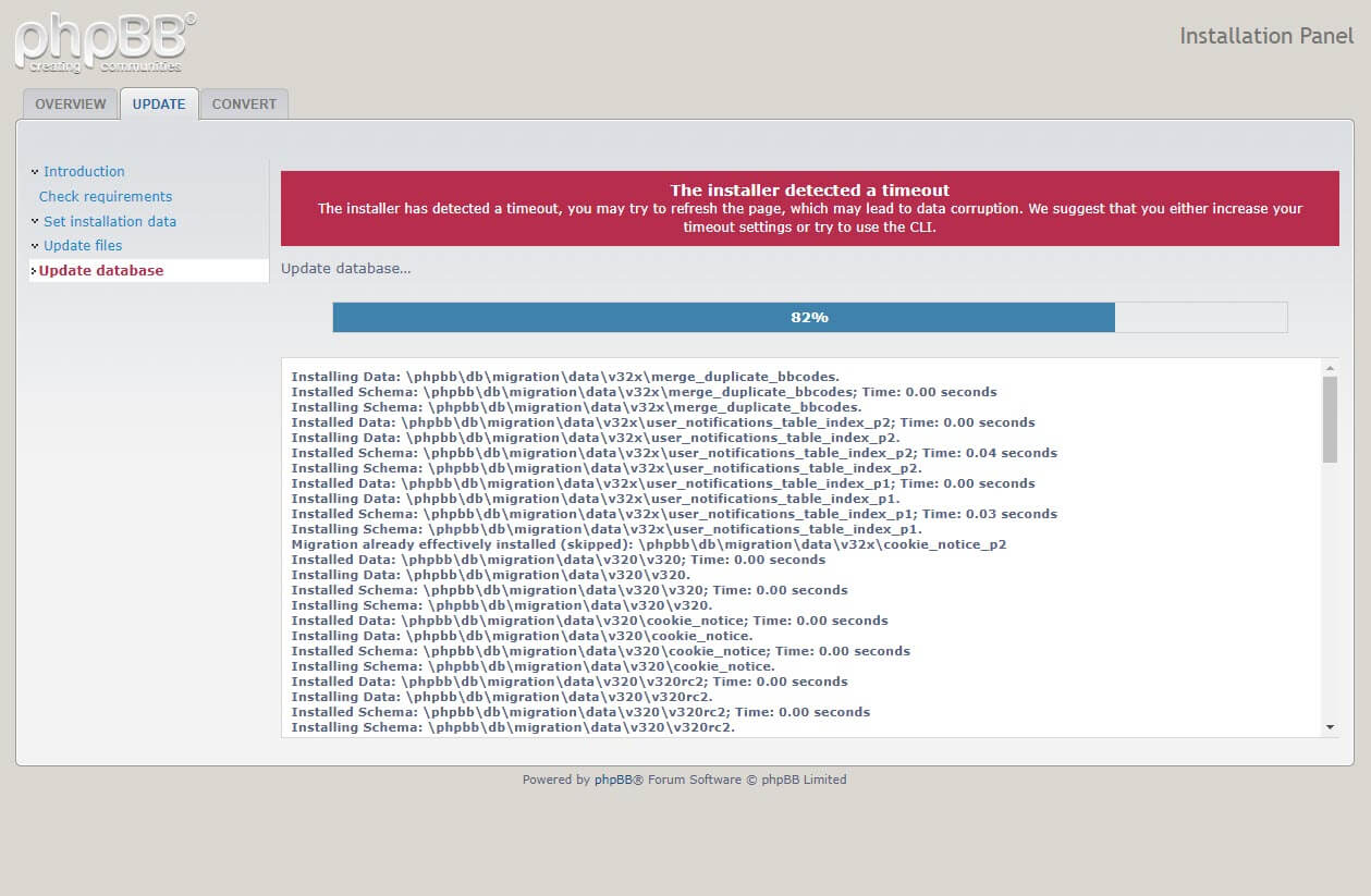 Hola Amigos! les comento que sigo (al parecer) fallando en la actualización del foro. Lo tenía con la versión phpbb3.2.0-dev y pensé que había encontrado la solución a este problema del "timeout" en este https://www.phpbb.com/community/viewtop ... #p15004501. Pero cometí otro de mis errores y en lugar de descargar la versión de actualización de 3.1 a 3.2, descargué la versión de 3.2 a 3.2.2 (no me di cuenta) y realicé todo el proceso con esta versión. El resultado fue el siguiente (aun con la modificación del archivo config.php como es cambiar "$dbms = 'mysql';" por "$dbms = 'mysqli';")...;