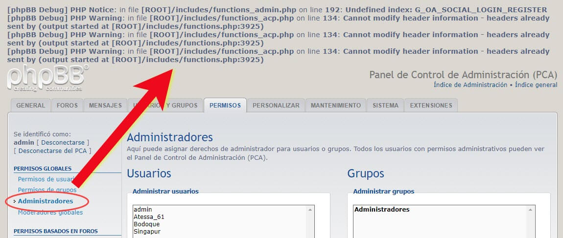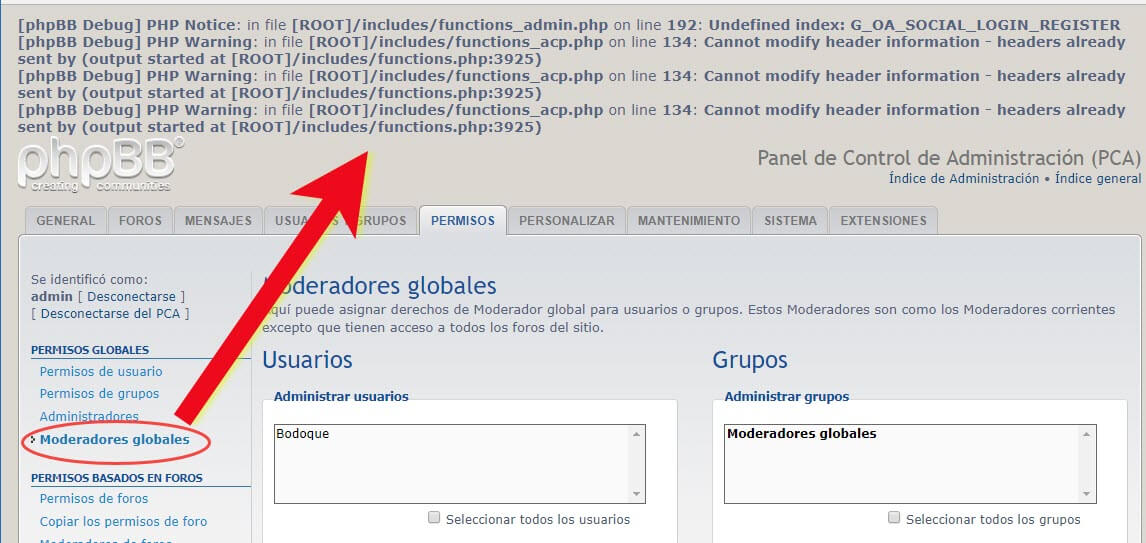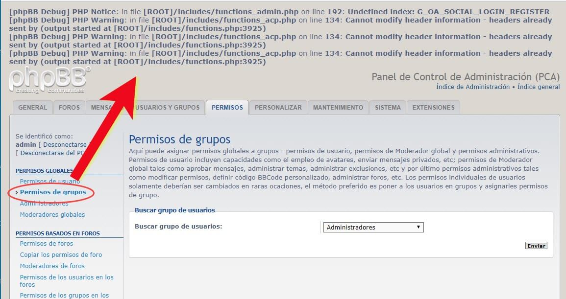 Bueno! comento que no hice nada, y el problema de las imágenes adjuntas se solucionó solo. Pero me seguía saltando el error del DEBUG en el PCA cuando por ejemplo abría cualquier items relacionado con GRUPOS o usuarios
