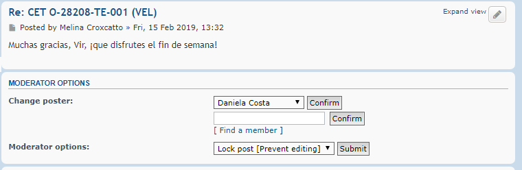 Lo extraño es que al ingresar a la info del mensaje, me propone como Change Poster al usuario que realmente creo el mensaje (Ivana).