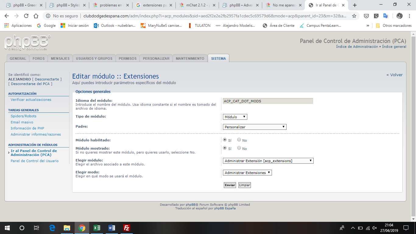 y cómo puedo hacer eso?? pero sí que está el módulo extensiones y tengo acceso completo al foro... pero no me aparece ni en la pestaña PERSONALIZAR, ni me aparece la pestaña EXTENSIONES.