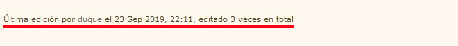 Buenas, en primer lugar enhorabuena por el foro. Vuestras respuestas me han ayudado mucho en el último mes. Somos una comunidad que viene de otro foro que va a cerrar y estamos acostumbrados a usar algunas cosas, entre ellas el motivo de mi consulta, que no sé si es fallo mío de configuración o que phpbb3.2 ya no permite hacer eso. En nuestro viejo foro, cuando editas cualquier mensaje aparecen siempre los datos que adjunto en la imagen: