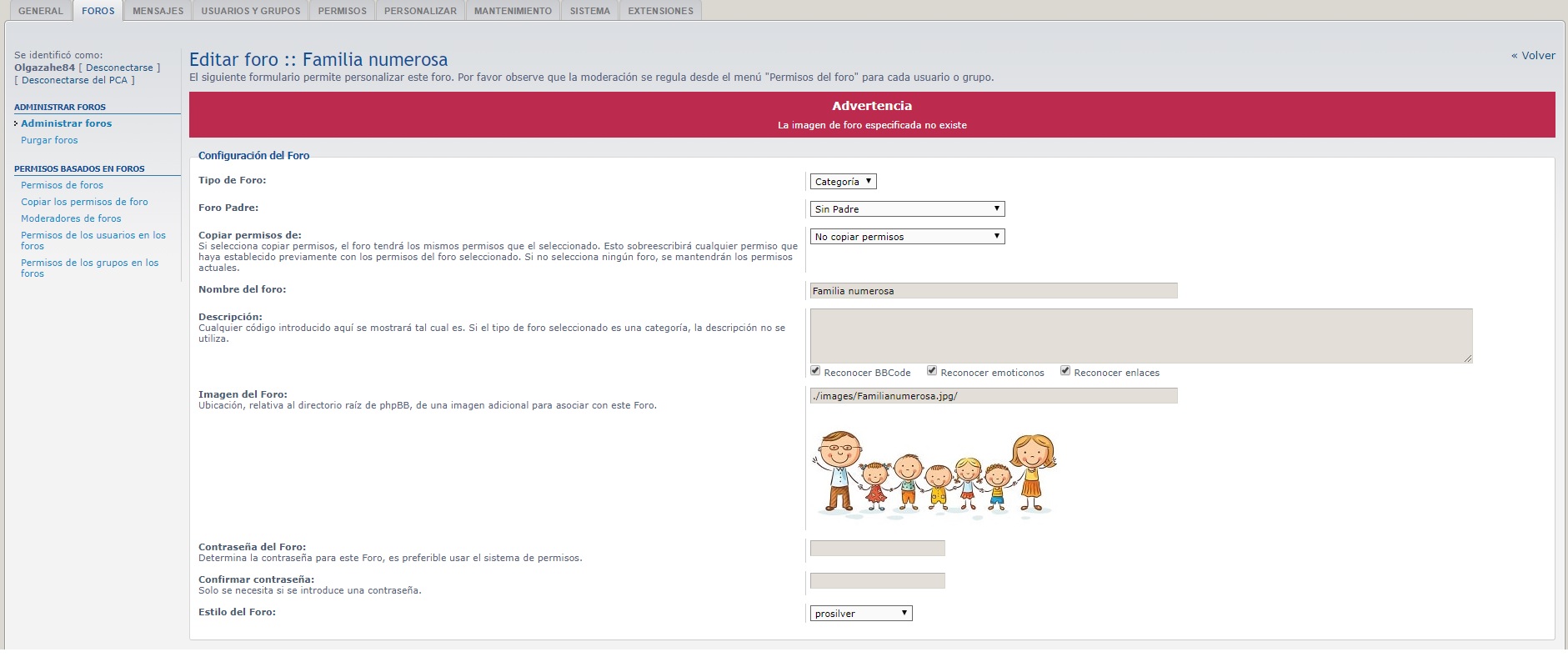 Es curioso, he puesto el último enlace que me indicaste (./images/Familianumerosa.jpg/) y parece que encuentra la imagen, porque en la pantalla de configuración del foro me la muestra. Pero lluego le doy a enviar para que se guarden los cambios, y sale la advertencia de "La imagen de foro especificada no existe"