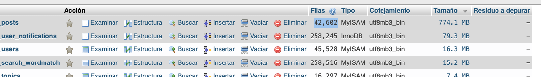 Pero la base de datos no ha bajado de ocupación, en la tabla de posts está en 774Mb cosa que me parece una barbaridad para ser solo posts.
