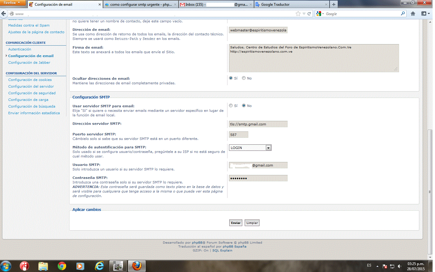 Una cosa mas, en tu cuenta de gmail comprueba desde su panel de configuración si tienes estos ajustes: