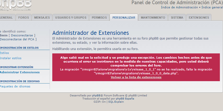Extensiones o MODs Instalados:Activity Stats 1.2.3-DEV, Advanced BBCode Box 3.1.4., Announcements on index 1.0.1., Annual Stars 1.0.0., Board Announcements 1.0.6., Board Rules 1.0.4., Category Background Image 1.0.1, Fade header 1.1.5. , Google AdSense 1.0.0., Google Analytics 1.0.2., Google Translator 1.0.0., Lightbox 1.0.5., National Flags 2.1.3., Paypal Donation 1.0.3., PM Welcome 1.0.1., Poster IP in Viewtopic 1.0.2., Red title for new topic and new reply 1.0.2., Right Side Random Image 3.1.0., Site logo 1.0.0-b4., Thanks for posts 2.0.2., Upload Extensions 3.1.2., Youtube Videos Gallery 1.0.3.