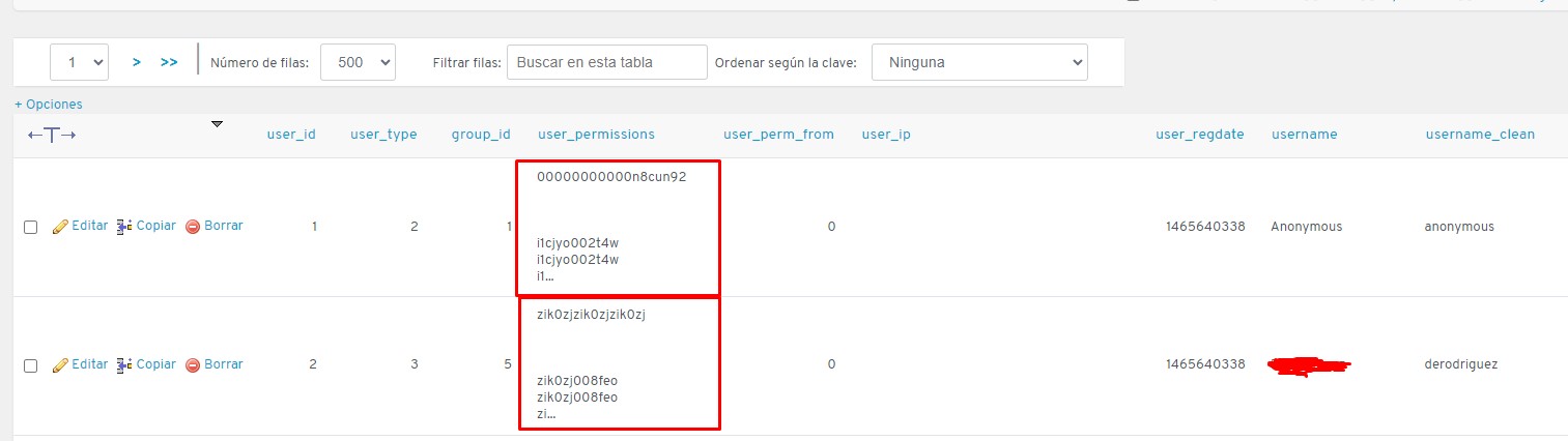 Después intente logearme con mi usuario admin y no podía...hasta que entre directamente a la BBDD y observe esto. En la parte de user_permissions esa informacion ( archivo adjunto )estaba en todos los usuarios.